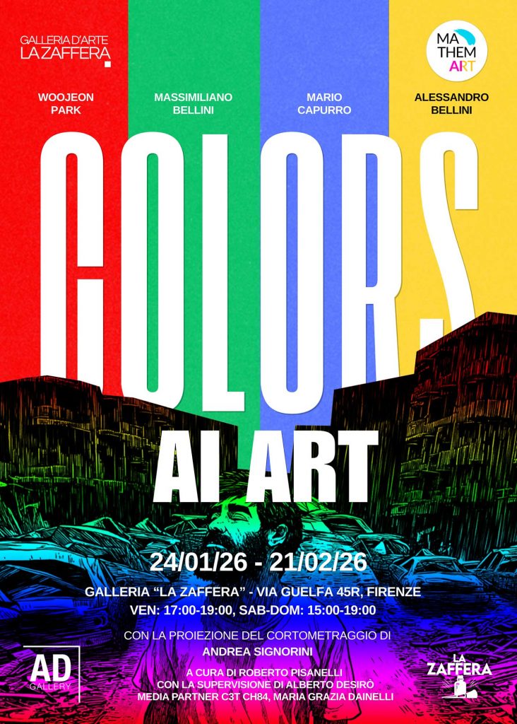 MathemArt presenta “Colors” una mostra di opere generate con AI ed un’opera esclusiva dell’artista Roberto Pisanelli. La Mostra sarà inaugurata il 24 Gennaio 2026 alle ore 17:00 presso la Galleria “La Zaffera”, in Via Guelfa 45r, Firenze.